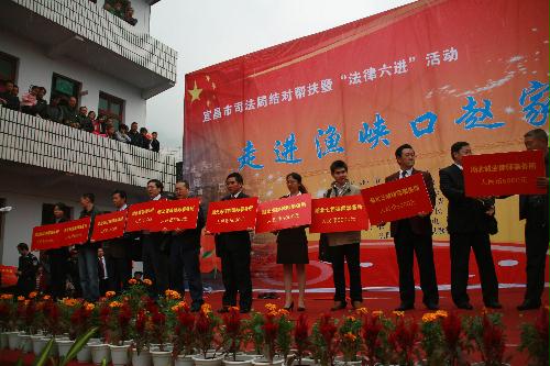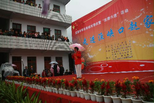 10月12日,市司法局、市劳教所、市律师协会、长阳土家族自治县司法局联合在长阳渔峡口镇赵家湾村举行结对帮扶暨“法律六进”文艺演出活动。市司法局党组书记、局长邹志坚带领市司法局在宜的县级领导和局机关部分科室、市劳教所、市直10家律师事务所及长阳司法局主要负责人参加活动。长阳土家族自治县委副书记卢斌,县委常委、组织部长孙志中和渔峡口镇党委政府主要领导,陪同邹志坚走访慰问了部分困难党员代表和椪柑产业发展大户,调研了渔峡口镇司法行政工作。