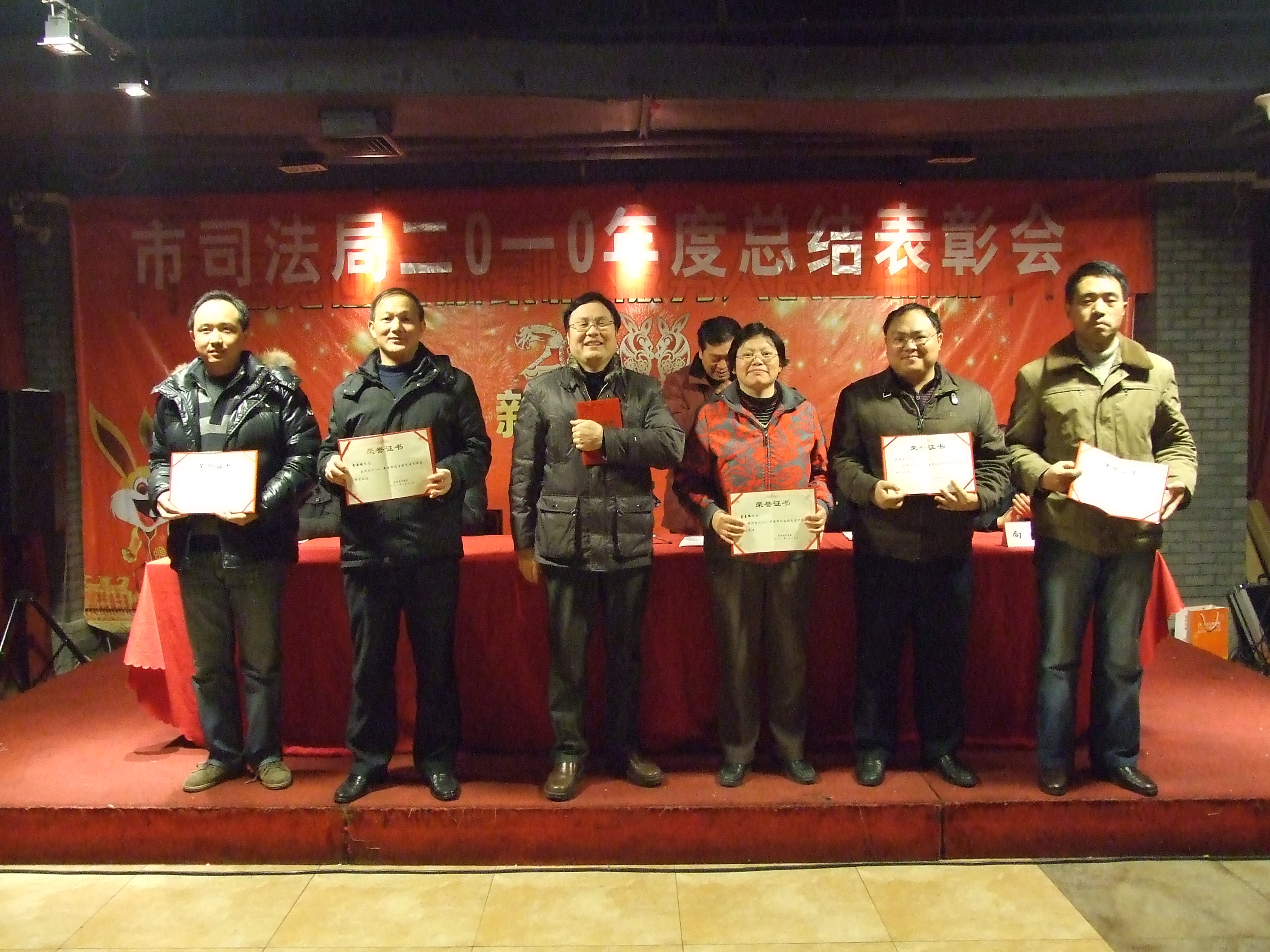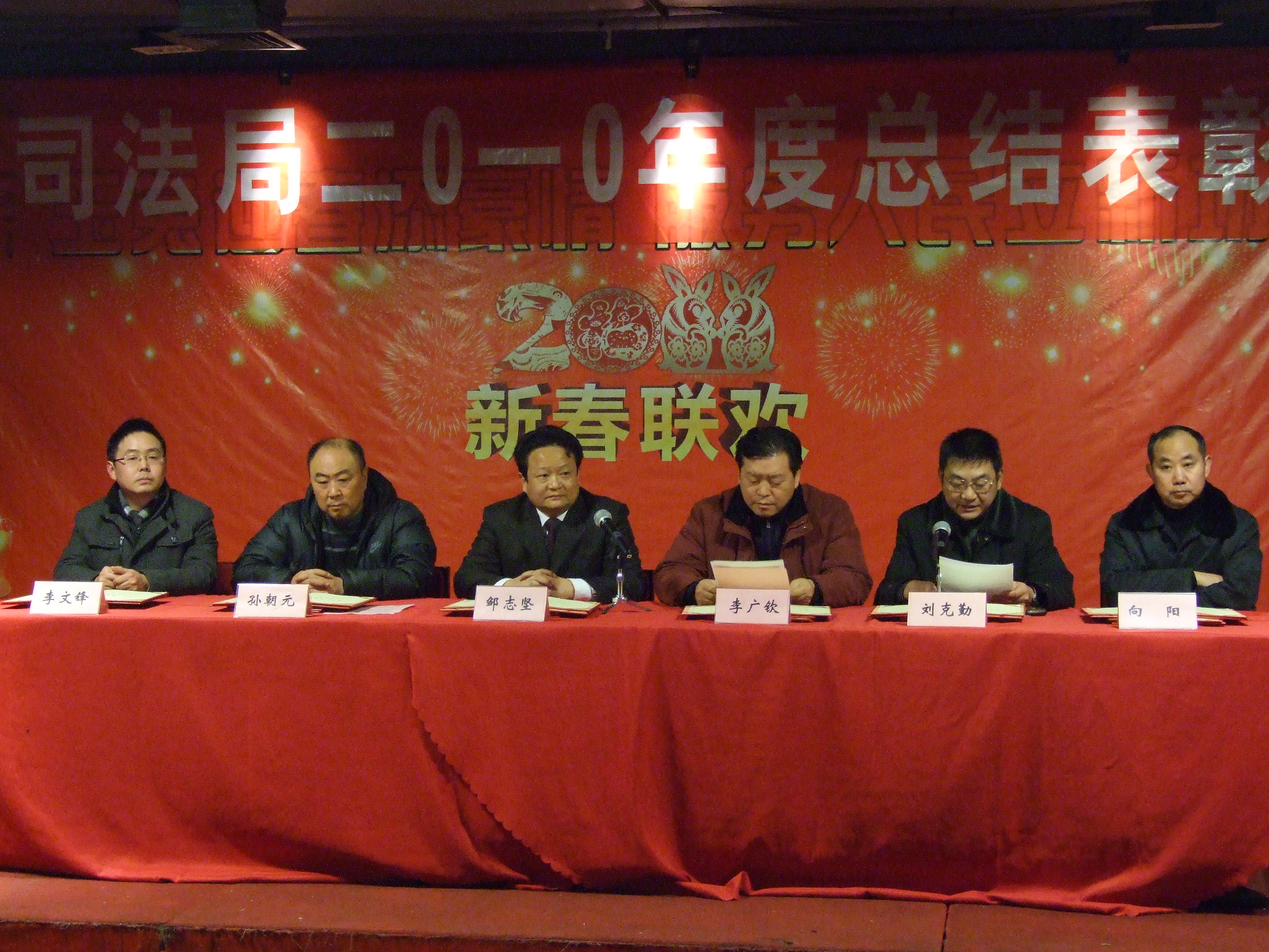 2011年1月26日下午,市司法局2010年度总结表彰大会暨市司法局、市律师协会“玉兔迎春添豪情 服务人民立新功”2011年新春联欢会在艳阳天大酒店隆重举行。市司法局党组全体成员、正副调研员和局机关全体干警、离退休老干部,市劳教所部分干警,市律协正副会长以及市直律师事务所律师共400多人欢聚一堂,喜迎兔年新春。