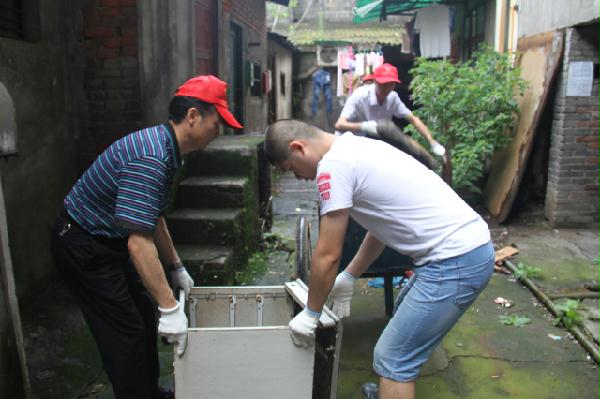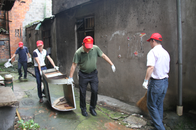 宜昌市司法局机关干警与社区工作人员一起清理卫生死角
