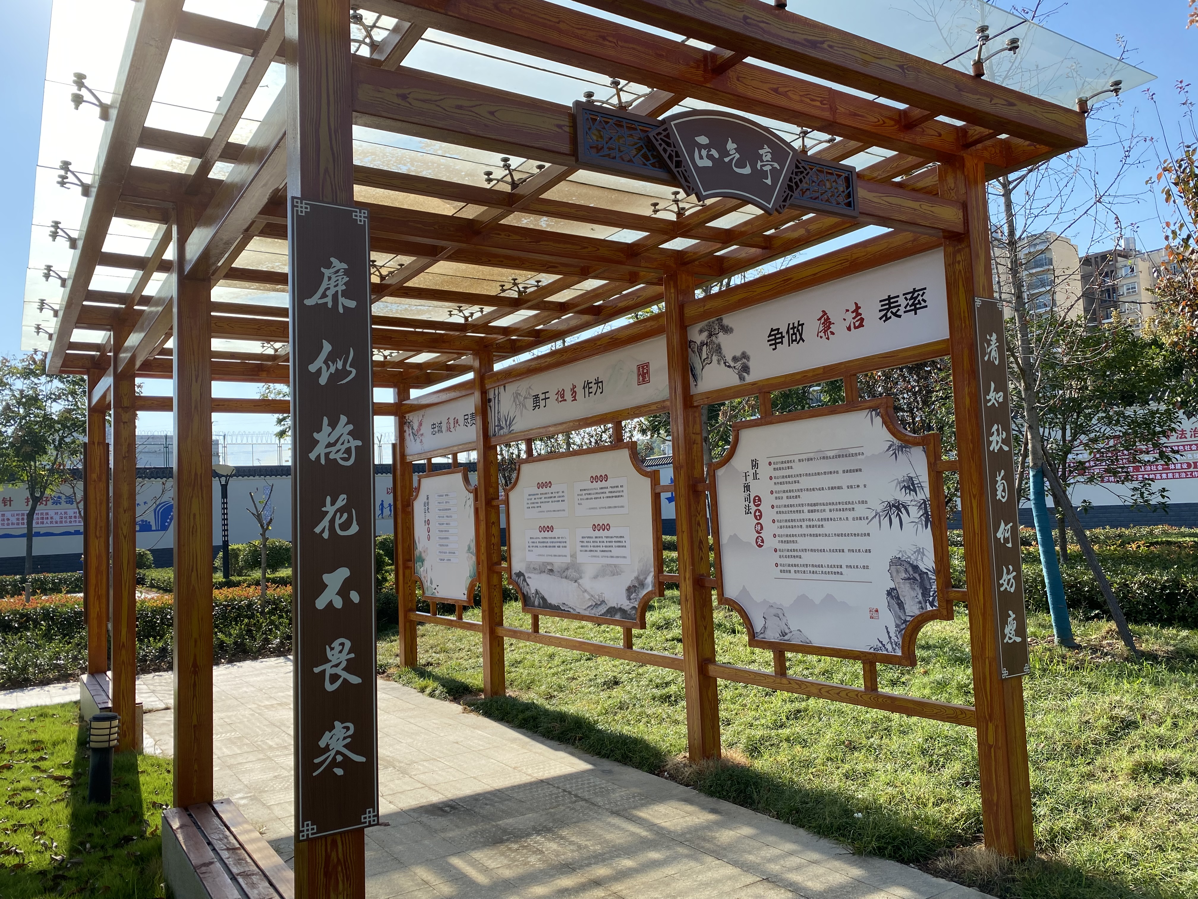 市强制隔离戒毒所党委从法、镜、廉、修等多个层面出发,认真搜集选取屈原廉洁文化和廉政漫画、格言警句为内容,在场所广场打造“清风亭”“正气亭”廉洁文化场景,树立以廉为荣、以贪为耻的良好风尚,推进廉洁文化在场所落地生根。在建设“清风亭”时,采取寓“廉”于景,将中国传统人物屈原廉洁文化打造成场所门口的廉洁文化微阵地。“正气亭” 结合戒毒工作职能,深入贯彻习近平总书记关于加强政法队伍建设的重要指示和训词精神,加强党对政法工作的绝对领导,巩固深化政法队伍教育整顿成果,贯彻落实《新时代政法干警“十个严禁”》,防止干预司法“三个规定”,守牢执法底线,推进全面从严管党治警。