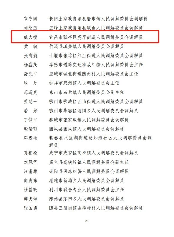 近日,司法部发布关于表彰全国模范人民调解委员会和全国模范人民调解员的决定,全省共有13个人民调解委员会和41名人民调解员上榜。其中,猇亭区司法局虎牙司法所所长戴大模同志凭借丰富的调解经验、出色的工作表现以及数以万计的成功案例,被司法部授予“全国模范人民调解员”称号。