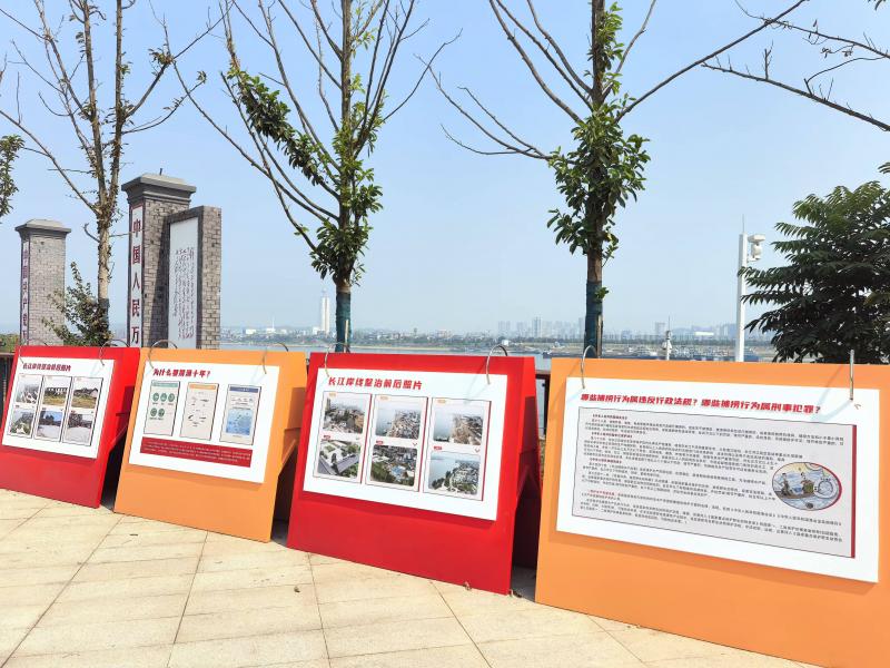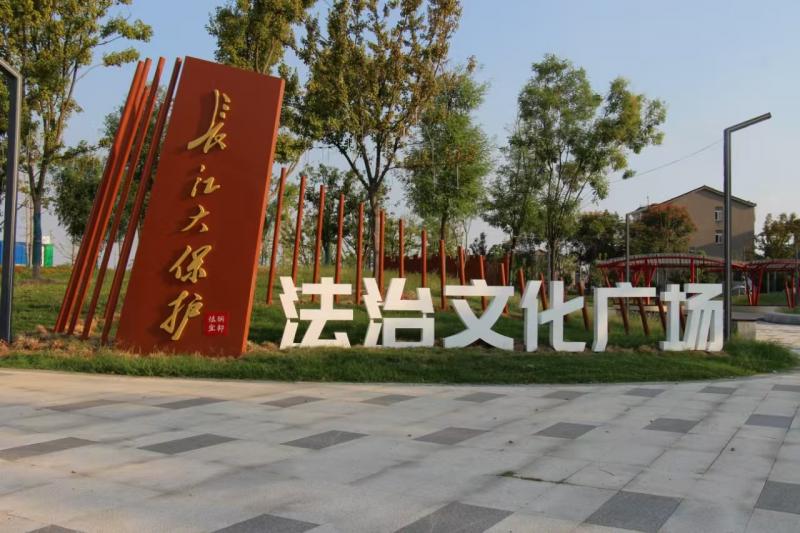 宜都市长江大保护法治文化广场分两大宣传区,滨江广场区域通过展牌、雕塑等方式融入法治文化元素,向居民多方位展示宜都在贯彻落实《中华人民共和国长江保护法》工作中,坚持生态文明、绿色转型等领域的具体举措和成效成果。另一部分文体活动区在突出“法元素”的同时,着力挖掘散落于镇内的农耕文化、渔猎文化、山水文化、城背溪新石器文化等“四大”非物质文化,播下长江生态法治文化的种子,让广大居民与游客于休闲游览中,自觉提高长江保护的法治素养,更为长江岸线增添一道亮丽的法治文化风景线。