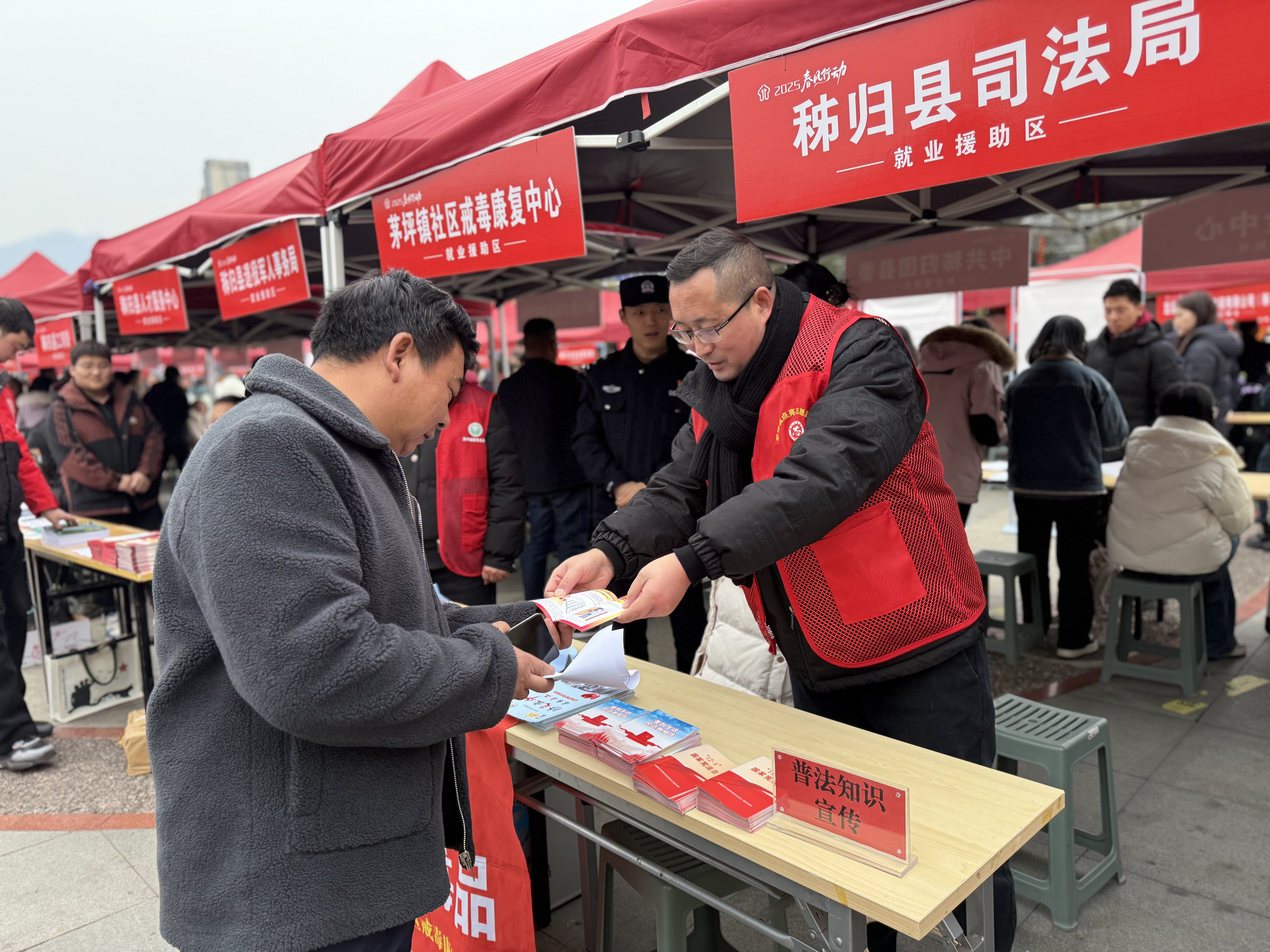 2月6日,秭归县2025年“春风行动”大型企业用工招聘会在凤凰山南门广场举行。为切实维护广大务工人员的合法权益,县司法局联合人社、工会、市场监管、退役军人等普法责任单位,在招聘会现场开展政策法治宣传活动,为求职者送上丰厚的“法治大礼包”,助力务工人员踏上新征程。